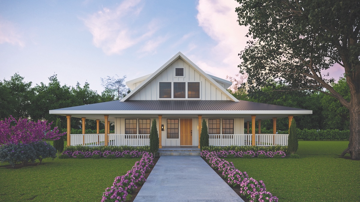 EUGENE, ORE. – May 13, 2025 – Elmshade blends timeless farmhouse charm with the ease of one-and-a-half-story living, making it a perfect choice for a vacation home or full-time residence. Wrapped on three sides by a spacious covered porch, this plan captures the essence of rural Americana—welcoming, relaxed, and made for connection. The exterior features board-and-batten siding, double-hung windows, and warm wood tones, creating a balanced, traditional facade that feels both cozy and refined.