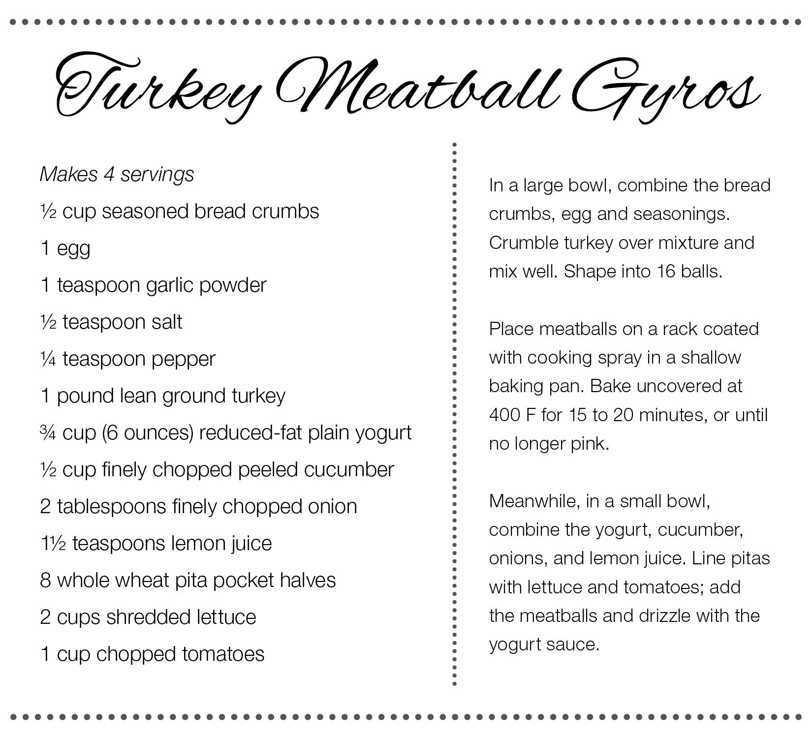 Such can be the case with Greek-inspired gyros. The fillings can vary depending on the ingredients available in the house. For “Turkey Meatball Gyros” from the “Taste of Home: Healthy Cooking Cookbook” (RDA Enthusiast Brands) by the editors of Taste of Home, the meatballs can be made the night before or in big batches and frozen to be used as needed. The yogurt sauce in this recipe is reminiscent of traditional Greek tzatziki, which is fresh and flavorful.